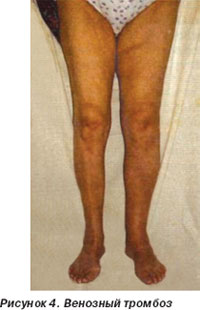 Отеки венозного происхождения. При остром тромбозе глубоких вен отек является основным, наиболее ярким признаком. Он развивается внезапно, часто среди полного здоровья, и поражает обычно лишь одну конечность. В течение нескольких часов, реже дней отек нарастает, полностью охватывая голень и/или бедро в зависимости от распространенности тромботического процесса и сопровождаясь распирающими болями в глубине мышечного массива. Для венозного тромбоза характерны отсутствие отека стопы и полное сохранение анатомических очертаний конечности (рис. 4). Это происходит благодаря преимущественному равномерному увеличению объема мышечной ткани, а не подкожной клетчатки. Суточные изменения отечного синдрома в первые дни и недели заболевания почти незаметны. Лишь спустя несколько месяцев, после формирования ХВН, появляется временная динамика отека, характерная уже для этого патологического состояния.
