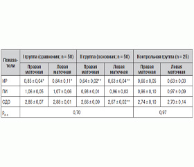 При оценке ультразвуковых данных размеров матки на 3-и сутки после родов установлено, что у родильниц основной группы длина, ширина и объем матки были достоверно меньше относительно группы сравнения и контрольной группы (р < 0,05) (табл. 1).
