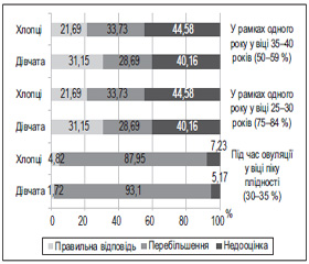 Було вирахувано в процентному відношенні, яка кількість дівчат та хлопців правильно відповіла на поставлені питання, а яка перебільшувала або зменшувала вік піку плідності (рис. 1).