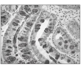 Результаты иммуногистохимического анализа показали, что доля клеток с положительным окрашиванием на CDX2 и TFF3 значительно изменилась после 26 недель терапии (точный критерий Фишера: 31,5 против 15,7 %, Р = 0,021 для CDX2 и 44,9 против 25,8 %, Р = 0,012 для TFF3) (рис. 2–5; табл. 8).