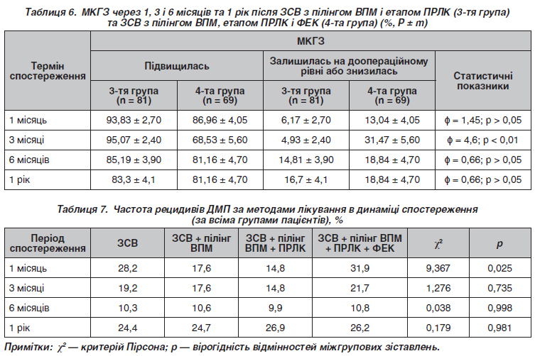 У табл. 7 надана частота рецидивів ДМП за методами лікування в динаміці спостереження (за всіма групами пацієнтів). За методами лікування частота рецидивів на різних термінах спостереження суттєво не відрізнялась від загальної тенденції. Через 1 місяць частішими відзначені рецидиви в пацієнтів, яким виконували ЗСВ з пілінгом ВПМ, ПРЛК і ФЕК, — 31,9 % (р = 0,025). Через 1 і 3 місяці мінімальна кількість рецидивів була зафіксована в пацієнтів, яким виконували ЗСВ з пілінгом ВПМ і ПРЛК (по 14,8 %); через 3 місяці і 1 рік частота рецидивів за методами лікування загалом не відрізнялась.