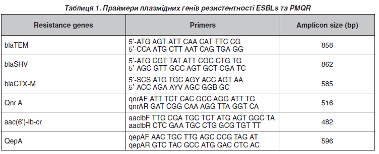 Повну екстракцію ДНК проводили для всіх зразків методом теплового шоку. Скринінг на наявність плазмідних генів резистентності ESBLs та PMQR проводили за допомогою аналізу секвенування полімеразної ланцюгової реакції (ПЛР). Праймери для визначення генів резистентності подані в табл. 1. Продукти ПЛР аналізували електрофорезом у агарозному гелі та фарбували етидієм броміду. Плазмідна ДНК, використана як маркер молекулярної маси, була гідролізована ферментом puc19 HpaII [13].