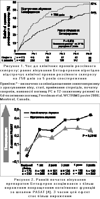 Результати цього дослідження показали, що ранній початок терапії Бетафероном у 40 % випадків більше ніж на 2 роки (на 750 днів) сповільнює розвиток клінічно вірогідного РС (Freedman et al. WCTRIMS poster 2008; Montreal, Canada) (рис. 1).